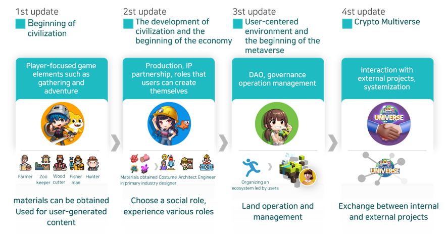 These sequential environment updates resemble the process of civilization development, and as the environment evolves, new content and economy in the metaverse are created, based on which the ecosystem can develop. Therefore, the final goal is to provide both enjoyment and value by establishing a true metaverse ecosystem through four large-scale updates depending on the service period.